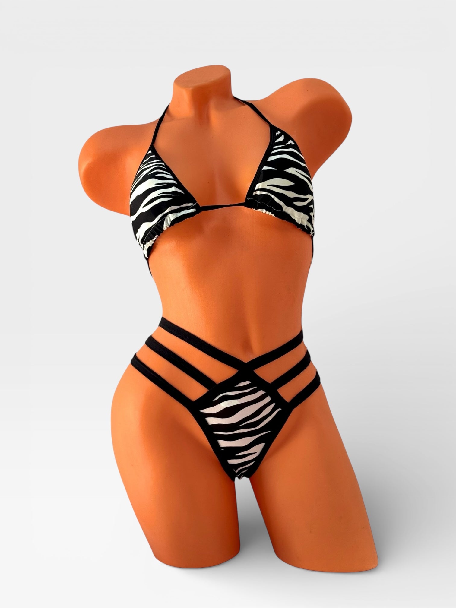 Bold zebra strappy bikini set designed for confident club performances and exotic dance shows. This set includes a single-strap top, a triple-strap thong, and matching stockings to complete your stage-ready look. Perfect for pole dance, nightclub performances, or any occasion where you want to shine under the lights. High-quality materials ensure comfort, fit, and style, making you feel unstoppable and glamorous. Fast EU shipping available.